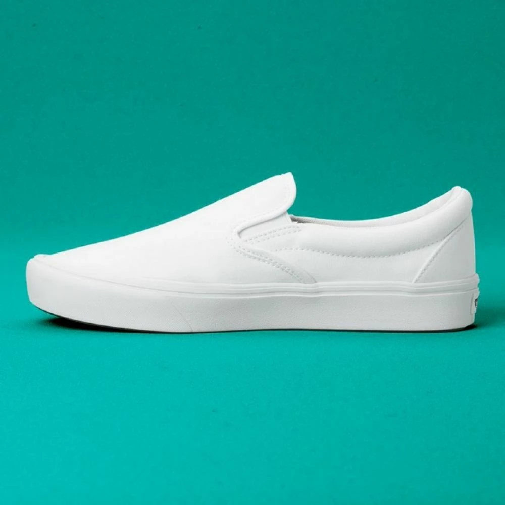 Vans has reinvigorated the classic Slip-On by introducing ComfyCush: a new softer, cushiony outsole that gives the Vans ComfyCush Slip-On in White a first-class fit that feels like walking on a cloud.